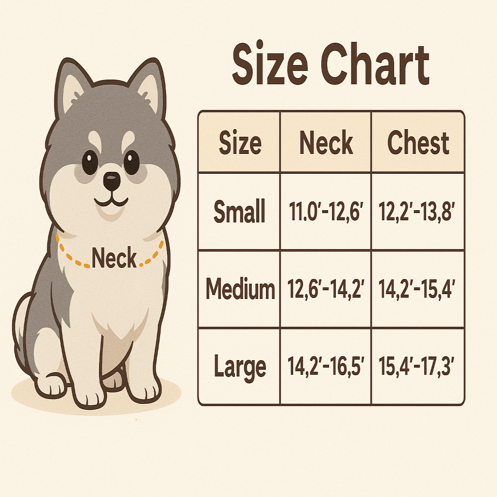 To measure your dog, use a tape measure to get the neck measurement at the base of the neck and the chest girth behind the front legs. If your dog falls between sizes, it is generally better to choose the larger size.